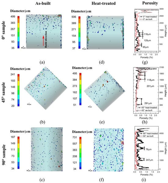 Orthographic projection of defects along the build direction: (a) the 0° as-built sample, (b) the 45° as-built sample, (c) the 90° as-built sample, (d) the 0° heat-treated sample, (e) the 45° heat-treated sample, (f) the 90° heat-treated sample, (g) porosity curves in the 0° samples, (h) porosity curves in the 45° samples, (i) porosity curves in the 90° samples.