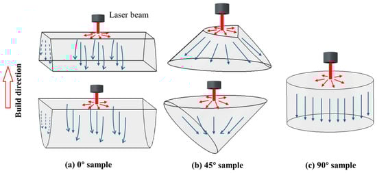 The porosity distribution along the build direction can be affected by cross-section changes in the AM metal parts, as shown in Figure 6. For the 0° sample and the 45° sample, the cross-section in the lower region increased along the build direction, as shown in Figure 6a,b. The input energy was transferred to the former region with a smaller area, and more energy could be used to heal the existing defects and reduce porosity. But in the upper region, the cross-section decreased along the build direction, and the energy was more diffusely transferred to the substrate material, thereby reducing defect healing and causing higher porosity. The defect-healing phenomenon was also observed by Chen []. For the 90° sample, the fixed cross-section can reduce the influential factor during LPBF and lead to a uniform distribution, as shown in Figure 6c.