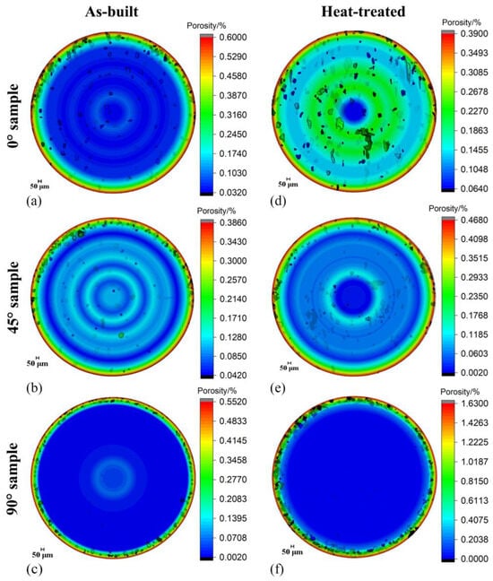 Defect along the radial direction and its porosity distribution: (a) the 0° as-built sample, (b) the 45° as-built sample, (c) the 90° as-built sample, (d) the 0° heat-treated sample, (e) the 45° heat-treated sample, (f) the 90° heat-treated sample.