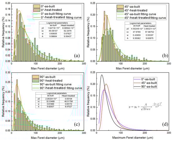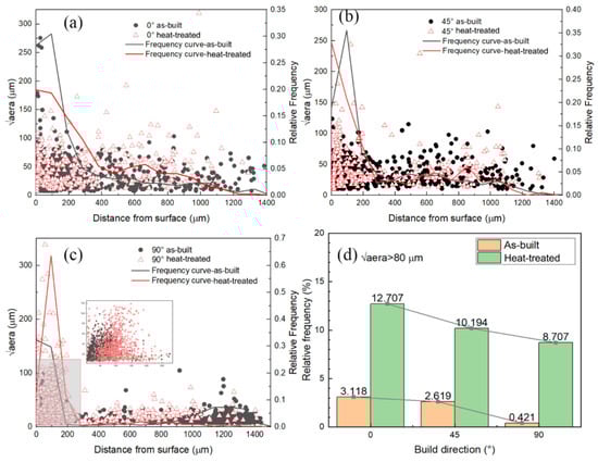 The equivalent defect size is defined as the square root of the defect projected area, , on the cross-section of the tested sample (along the loading direction) in this study, and the irregularly projected shape of a single defect is regarded as an ellipse. and its distance from the sample surface of the 0° sample, the 45° sample, and the 90° sample are plotted in Figure 14. As the defect is distributed along the radial direction in Figure 7, the defect number decreases as the distance from the surface increases, which can also be clearly illustrated by the frequency curves of solid lines in Figure 14a–c. A large proportion of was less than 150 μm, and the defect larger than 80 μm was calculated and is shown in Figure 14d. After the heat treatment, the relative frequency of larger defects increases greatly, but there is still a linear relationship with build direction.