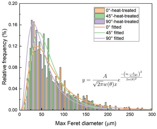 The maximum Feret diameter of internal defects of all samples was detected and is shown in Figure 8. The defect size shows the same distribution trend, and it can be fitted by a lognormal distribution function:
