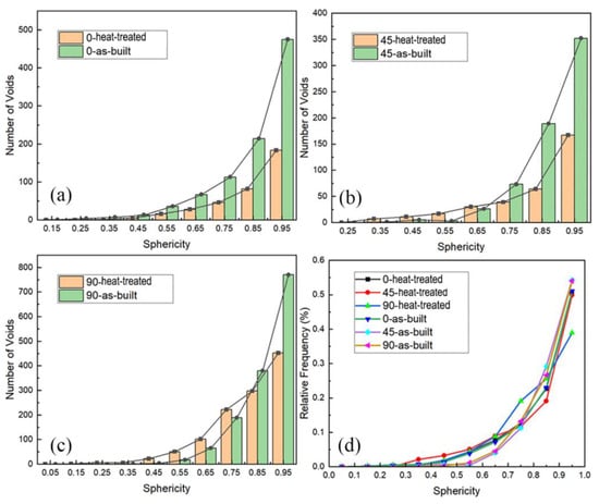 A higher proportion of pore defects can be observed in three kinds of samples, whether the heat treatment was carried out or not. The sphericality distribution can be changed by heat treatment, as shown in Figure 10a–c. The pore defect can coalesce into an elongated LoF defect under high-temperature conditions, and then a significant proportion decrease of the defect with a large sphericality occurs. The more pore defects, the more obvious the proportion change, especially in the 90° sample, as shown in Figure 10c. The fitted relative frequency curves of all samples are compared in Figure 10d, and it can be seen that the sphericality distribution is independent of build direction.