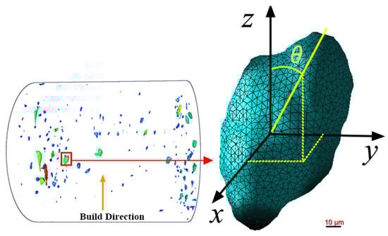 The percentage of LoF defects (Ψ < 0.7) cannot be neglected, which indicates that there are a lot of long and narrow defects with a large aspect ratio. The difference in defect orientation is of great significance to crack initiation and propagation. Therefore, the defect orientation is analyzed statistically. In Dragonfly, the defect orientation is determined by an eigenvector associated with the smallest eigenvalue of the inertia tensor, which represents the axis of the easiest rotation, and the long axis of the defect. The defect orientation in this section is defined as the angle between the major axis of the defect and the build direction, as shown in Figure 11. It means that the defects with a lower orientation are prone to distributing along the build direction, while the defects with a large orientation are distributed perpendicular to the build direction.