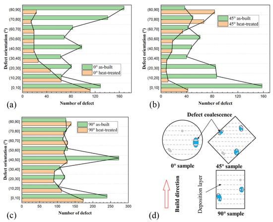 In Figure 12a, a reverse distribution is obvious for the 0° sample. The defects in the 0° as-built sample are mostly distributed along the scanning direction. After the heat treatment, the defect coalescence between adjacent layers leads to an increase in defect proportion along the build direction. The reason is that defects in the subsurface region are more likely to fuse along the axial direction of cylindrical samples under high temperatures, and then the defect orientation is deflected, as shown in Figure 12d.