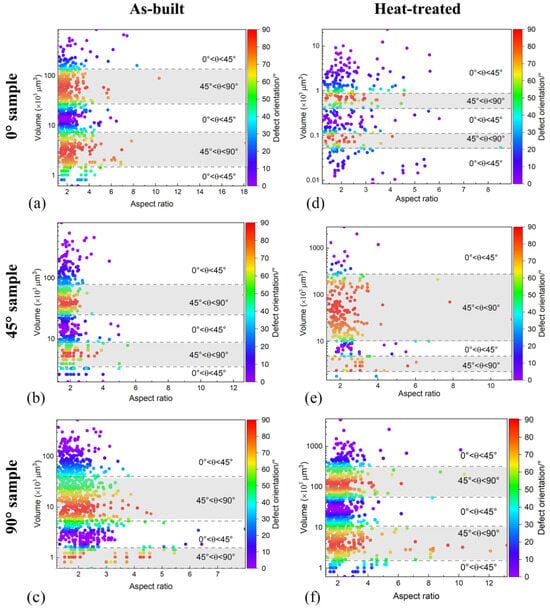 Volume–defect orientation–aspect ratio relationship: (a–c) the as-built sample in 0°, 45°, and 90° build directions, (d–f) the heat-treated sample in 0°, 45°, and 90° build directions.