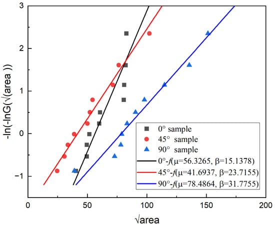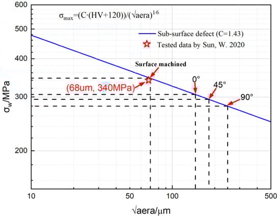The relationship between the fatigue limit and the defect size is shown in Figure 17. As mentioned, cracks in AM alloy can initiate at a subsurface defect, and then the location factor C equals 1.43 in Equation (7). Finally, the fatigue limits are calculated: = 306 MPa, 295 MPa, and 280 MPa for the 0° heat-treated sample, the 45° heat-treated sample, and the 90° heat-treated sample, respectively. It is shown that the different defect distributions related to the build direction can cause fatigue anisotropy of LPBF Ti6Al4V, and the fatigue limit decreases with the increase in the build direction.