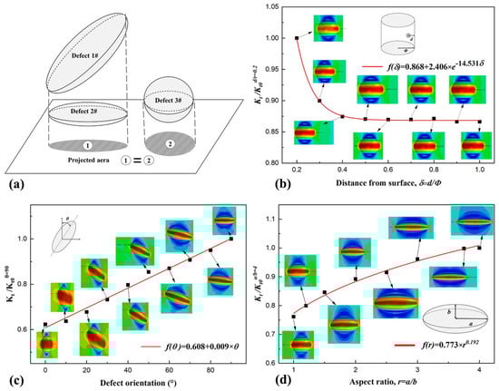 The was calculated firstly by the projected area of the defect along the loading direction. It should be noted that the same can be obtained by different types of defects 1#, 2#, and 3#, as shown in Figure 18a. The defect characteristic effect was simulated by the finite element method (FEM), and the results are shown in Figure 18b–d.