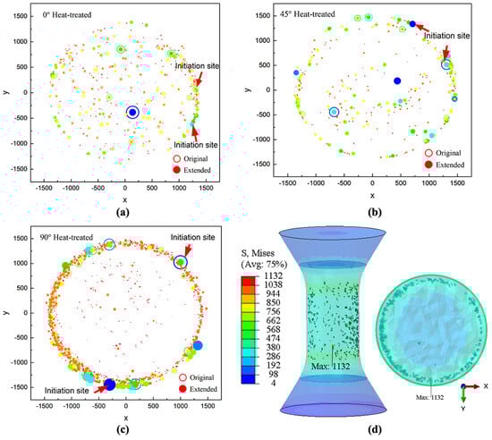 and and can be obtained by Equations (12)–(14). Thus, indicated by the filled circles were compared with their original values indicated by the hollow circles, as shown in Figure 19. It was observed that both the maximum value and fatigue crack initiation sites in three kinds of samples were changed, and the distributions are shown in Figure 19a–c. The estimated reduced to 111 μm, 149 μm, and 204 μm for the 0° heat-treated sample, the 45° heat-treated sample, and the 90° heat-treated sample, respectively. When the real defects in the 90° heat-treated sample were extracted to an FEM model, the stress distribution was obtained and is shown in Figure 19d. It shows that the crack initiation site obtained by the FEM model is identical to that predicted by . can be better used to predict the fatigue limit of the LPBF Ti6Al4V alloy than the original .