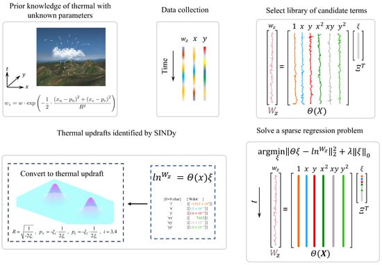 The structure of this article is as follows. In Section 2, we present and elucidate prevalent models of thermal updrafts, as well as discuss the requisite measurement methods for identifying these models. Subsequently, the SINDy algorithm is introduced in Section 3, accompanied by a delineation of the specific configurations for model identification. In Section 4, the performance of the SINDy algorithm under unobservable conditions is analyzed through software-in-the-loop simulations (SITL). Then, the online feasibility of the proposed method is further validated through hardware-in-the-loop simulations (HITL). Finally, the work in this article and areas for further improvement in the future are summarized.
