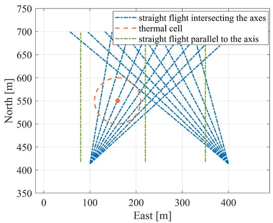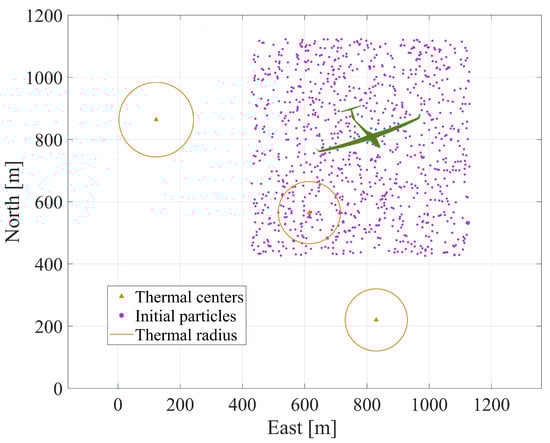 Equation (13) indicates that the search for thermals is only conducted within a rectangular area of 700 m around the aircraft’s position. represents particles being uniformly scattered in the designated area as shown in Figure 2.