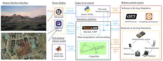 Initially, experiments are tested through SITL under observable conditions to validate the implementation of modeling, and algorithm design as illustrated in Figure 3. All the components are appropriately connected to the flight control algorithm system, ensuring the consistency of input-output signals with the actual fixed-wing aircraft. Similar to real flight environments, the fixed-wing transmits updated sensor data or state estimation information, including attitude angles, angular rates, positions, and velocity, to the flight controller. Subsequently, the algorithm sends PWM commands back to the model, establishing a closed-loop simulation. SINDy is executed online using Python 3.8.0 code to search for thermal cells, while incorporating upper-level control logic in the code to switch flight modes. The guidance and navigation algorithms are implemented based on the PX4 Firmware (PX4-1.12.3), a widely used open-source flight control software. The core communication architecture of the experiment, depicted by the solid black box in the diagram, serves as the central hub for all data. The model is reconstructed and aerodynamic parameters are computed based on the existing aircraft, with some adjustments made to the physical shape and aerodynamic coefficients to ensure smooth and controllable motion. The model file is generated in Simulink and subsequently transferred to CopterSim, as indicated in the bottom left corner of the diagram. The underlying control system is connected to CopterSim through TCP/UDP, and MAVLink is utilized to transmit actuator commands from the PX4 runtime output. CopterSim not only relays MAVLink messages and transmits the real-time status of the glider to the upper-level control system but also receives planning commands from the purple module to send to PX4. In order to streamline communication and reduce complexity, messages are packed in UDP format. Finally, the aircraft’s pose and actuator parameters are sent to the 3D engine for visualization, as indicated by the solid yellow box.