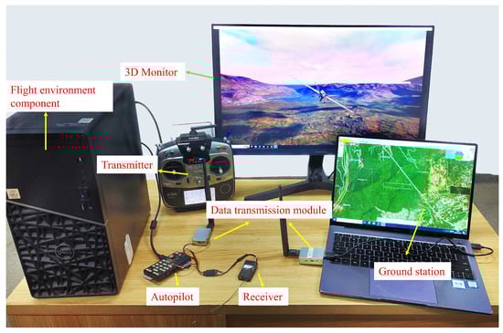 Prior to actual flight tests, hardware-in-the-loop simulation is performed to assess the performance of SINDy. Unlike SITL, the fixed-wing model in HITL operates in real-time, synchronized with the actual clock, ensuring accurate results. Win10WSL serves as the cross-compilation environment for flashing the firmware onto the Pixhawk4 autopilot hardware. The algorithm is uploaded to the flight control hardware environment. Pixhawk4 integrates powerful processors, sensor technology, and the NuttX real-time operating system, enabling flexible and reliable control of the glider. In this stage, communication is established using cable signal lines instead of virtual network transmission as shown in Figure 4. CopterSim transmits sensor data, including a barometer and magnetometer readings, to Pixhawk4 via serial communication. The PX4 firmware running on the flight controller estimates the state information using filtering algorithms, such as EKF. The state is then broadcast to the information bus. The controller subscribes to messages from the information bus, calculates control commands, and sends them back to CopterSim. Additionally, the wireless data transmission module is equipped to transmit the glider’s status and flight parameters to QGC for monitoring. In case the glider deviates from the expected flight path or experiences loss of control, intervention may be performed by the operator. HITL facilitates the deployment and execution of control algorithms on real embedded systems, providing an indoor simulation environment for outdoor flight testing.