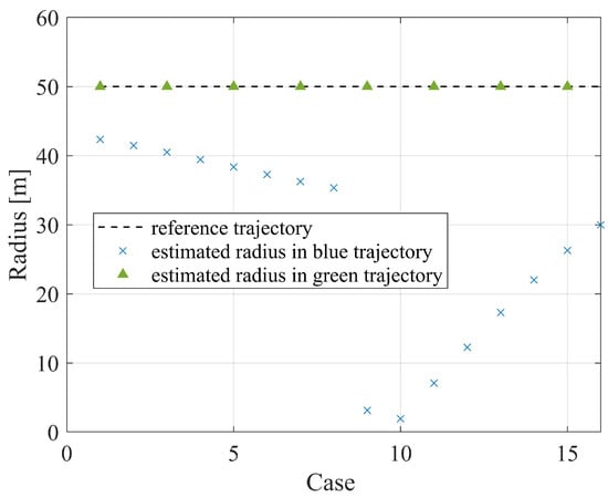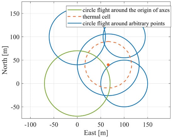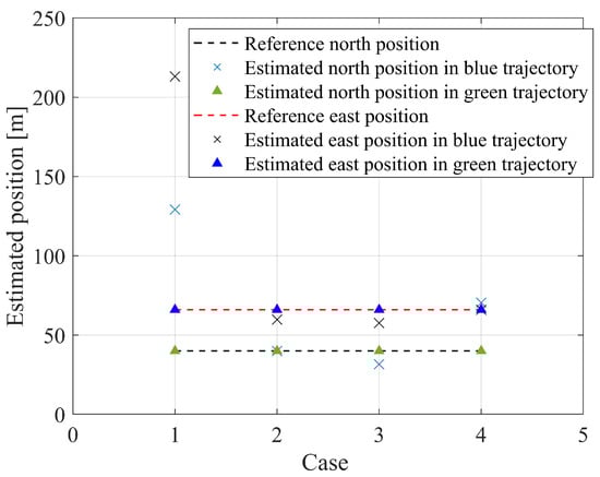 The observability matrices are singular when in circular flight [], rendering them unidentifiable through updraft measurement using PF. Although the intensity and radius of the thermal are unobservable, the SINDy algorithm seems to be able to estimate the northward and eastward positions within specific flight regions. As depicted in Figure 8, the green trajectory reflects the central point of the circular flight at the origin of the coordinate axis, while the centers of the blue tracks are arbitrary. This conclusion is further elaborated in Figure 9. The estimated position around an arbitrary point is represented by the symbol ×. It is observed that only the north in case 2 and the east in case 4 can be accurately determined, while positions estimated in most cases are inaccurate. If the coordinate axis is selected as the origin, the thermal is accurately located in any direction.