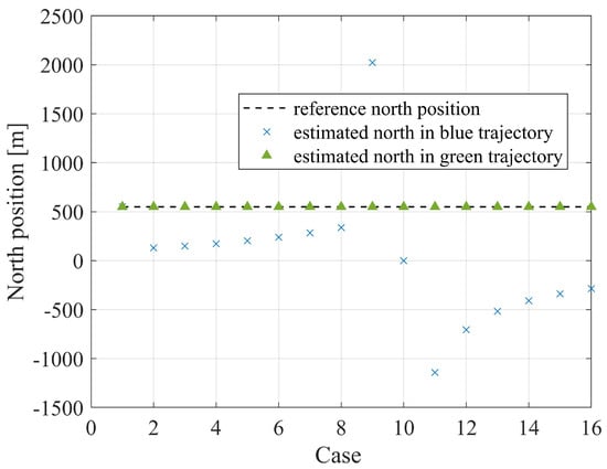 In Figure 7, symbol × signifies the case of intersecting with the coordinate axis, where a significant deviation between the estimated north position and the true value is observed. However, the green triangles demonstrate the estimated results are close to the true values. This indicates that compared to the parallel trajectory, the accuracy of estimated north positions severely decreases when the flight intersects with the coordinate axis. While we cannot mathematically prove this phenomenon, the failure of the SINDy algorithm may be related to unobservability intuitively.