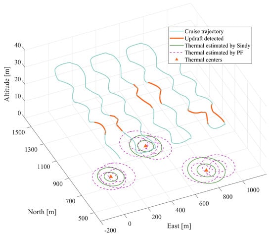 To completely demonstrate the performance of SINDy, the identification is evaluated in observable flight modes. The glider’s flight trajectory is simulated using a lawnmower pattern, primarily consisting of irregular curves. This pattern is chosen to minimize the occurrence of straight-line and circular flights, thus ensuring a relatively high level of observability for the parameters to be estimated. Figure 10 portrays the flight trajectory, consisting of light blue and orange segments. The thick solid orange line represents the trajectory during the detection of updrafts with amplitudes surpassing a specific threshold for a defined duration, while simultaneously enabling the PF algorithm.