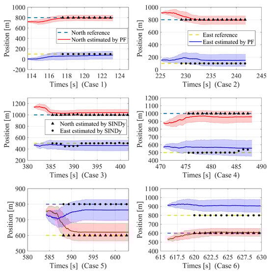 Triangles and circles are symbolized to recognize eastward and northward directions, respectively. To enhance clarity and conciseness, the points in the plot are plotted at a fixed interval, lower than the frequency of the SINDy execution. Figure 11 demonstrates that from Case 3 to Case 6, SINDy consistently outperforms PF in terms of position estimation. Regardless of estimating the east or north position of the thermal, the error of PF’s identification is several to dozens of times greater than that of the SINDy algorithm. In Case 3 and Case 4, SINDy exhibits slight deviations in estimating the east position. However, in most cases, its estimated values coincide with the setpoint. It is noteworthy that the estimations exhibit a slight delay compared to PF due to the requirement of SINDy to accumulate a specific quantity of physical quantities for the computation of the information matrix. Once the collected updrafts reach the predetermined threshold, SINDy precisely locates the thermal cell.