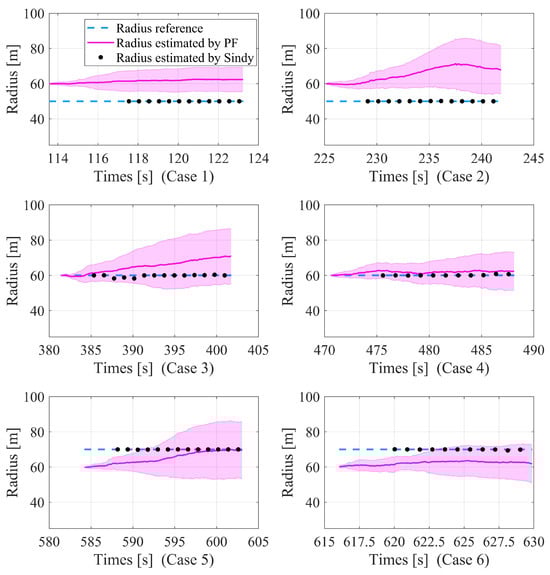 The estimated thermal radius is depicted in Figure 12 in solid black circles, with blue dashed lines representing the true values of the radius. In Case 1 and Case 2, the radius of the thermal source is set to 50m. The estimated values of the SINDy algorithm are close to the true values. In comparison, the identification of PF exhibits significant deviations, particularly in Case 2. In Case 3, we attempted to set the initial values of PF near the setpoint, yet the PF algorithm still fails to converge. In contrast, the error value of SINDy is within 3 m, outperforming PF in the identification of the radius. Monte Carlo simulations of the PF algorithm demonstrate that the mean estimations during the fourth and fifth running closely align with the true values. However, the 3 variance bands for each estimation progressively expand, possibly as a result of the relatively brief period of algorithm activation. It is further confirmed by examining Case 1 and Case 2, where the duration of the encounter between the glider and the thermal is longer compared to other instances. Comparing these two algorithms, it is apparent that the issues encountered by PF during identification are absent in SINDy. In all six cases, SINDy accurately identified the radius of the thermal source.