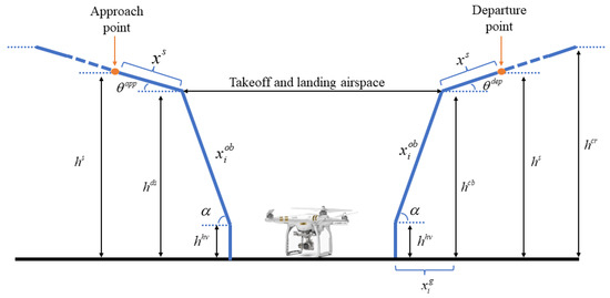 Descend could be considered as the reverse process of climb; therefore, the aerial distance of climbing and descending and the angles of departure and approach are deemed to be the same in Equation (22). The climbing distance in the air consists of the aerial distance of obstacle surpassing and the distance required to climb to the cruising altitude . Due to the need for the eVTOL to hover before climbing, the climbing height during the obstacle surpassing stage should be subtracted by the hovering height (Equation (23)). Subsequently, to obtain the aerial distance of obstacle surpassing, the value of is further divided by the sine of the climb angle α acquired through Equation (24) where is the ground distance traveled while surpassing obstacles equal to eVTOL i’s wing span (WSPi) and could be changed based on different conditions and regulations as Equation (25) demonstrates. The distance required to climb to the cruising altitude in Equation (22) can also be calculated using the same method with its climb angle α equal to the departure angle .