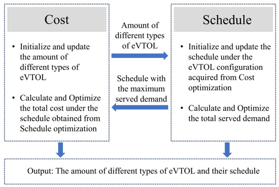 In this research, a Joint Optimization of Cost and Schedule Particle Swarm Optimization algorithm (JOCS-PSO) has been utilized to solve this joint routing and charging model with safety concerns. The detailed process of this algorithm is demonstrated in Algorithm 1. The JOCS-PSO algorithm utilized in this research consists of two parts where the Cost optimization part is used to initialize the configuration of different types of eVTOL and has the total cost optimized under the schedule acquired from the inner algorithm, while the Scheduling Part is used to maximize the served passenger amount through iteratively updating the schedule on the basis of this eVTOL configuration acquired in the Cost optimization part. The relationship between the Cost and Schedule Parts is demonstrated in Figure 2. To simplify calculations, the total cost is converted into a negative value to seek its maximum.