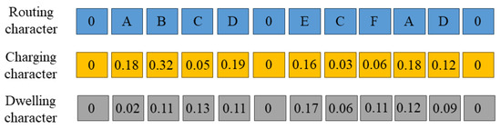 In the Cost Part, each individual containing B (the number of types of eVTOL) variables has been initialized and will be transferred to the inner layer. In the Scheduling Part employed in this study, each individual consists of three characters. The first character represents the sequence of vertiports that each eVTOL passes in time order, with 0 used as a separator between different eVTOLs. The second indicates the charging duration for each eVTOL at the corresponding vertiports defined in the first character. The third character denotes the additional dwelling time for each eVTOL at the corresponding vertiports as Figure 3 illustrates. The whole schedule of these eVTOLs is made up of these three characters.