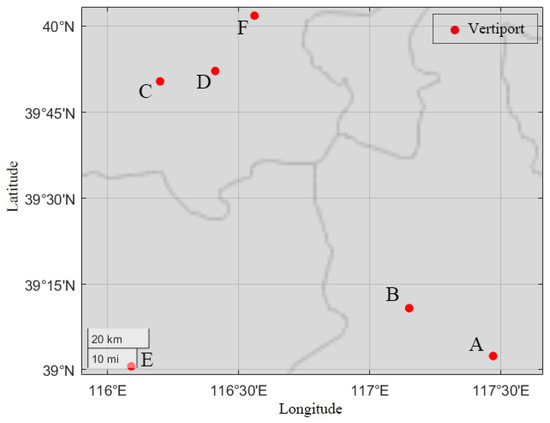 Moreover, in order to reduce congestion and avoid collision or conflicts between different types and directions of eVTOL, the cruising altitude of the eVTOL in Table 5, acquired on the basis of the CAAC [23] and the performance of the eVTOL [24,25], is divided into four altitude layers according to the cruising altitude of these two eVTOLs. Two of the layers with a higher altitude (500–1000 m) are assigned to Geely Aerofugla AE200 X01 for cruising as it has a higher speed than Xpeng X2. One of these two layers was allocated to flights flying from vertiports with earlier alphabetical codes to later alphabetical codes, while the other layer is the opposite. The assignment of altitude to Xpeng X2 can be obtained similarly. The allocation of altitude is illustrated in Table 5 in detail. Furthermore, each altitude layer is deemed to have the ability to accommodate 20 eVTOLs at the same time; namely, the airspace is enough for all the eVTOLs to keep the safety interval distance at the same time while cruising. Thus, the waiting time in the air is 0 () in this case study. Moreover, it is worth mentioning that the energy consumption between vertiports in Equations (7)–(11) have also been calculated on the basis of Table 5.