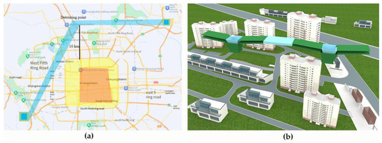 Vertiports were selected based on the demand in each different city, with three vertiports in Beijing, two in Tianjin, and one in Xiong’an (Hebei) as shown in Figure 4 [21]. For the safety concerns of citizens and the protection of government and military facilities, appropriate detouring measures should be undertaken while cruising as illustrated in Figure 5a where the distance between the route and these areas should be over 10 km according to the regulations of the CAAC [22]. The red area in Figure 5a represents the prohibited area; the yellow area represents the densely populated region. The whole flight process is demonstrated in Figure 5b. The distance between vertiports considering detouring measures is illustrated in Table 3. The takeoff and landing procedure parameters in Figure 1 are shown in Table 4 [18]. The variable in Figure 1 equals the wing span of the eVTOL. The departure and approach point utilized to calculate the safety time interval in this research is 152 m above the vertiport, which is the end point of the obstacle limitation surface (OLS) and the takeoff climb/approach surface according to the EASA [17]. Furthermore, based on the report by the EASA [17] and the wing span of the eVTOL used in this research, the maximum area required for the eVTOL to take off and land is 900 m2, while, according to the research conducted by Y. Wang [18], the vertiports in Beijing–Tianjin–Xiong’an are at least 4200 m2. Thus, the vertiport can accommodate at least four pads with a sufficient distance interval between each other. Owing to the sufficient distance interval, the vortices generated by eVTOLs during simultaneous takeoff and landing on these four platforms will not affect each other. Therefore, the vertiport can accommodate four eVTOLs taking off and landing at the same time.