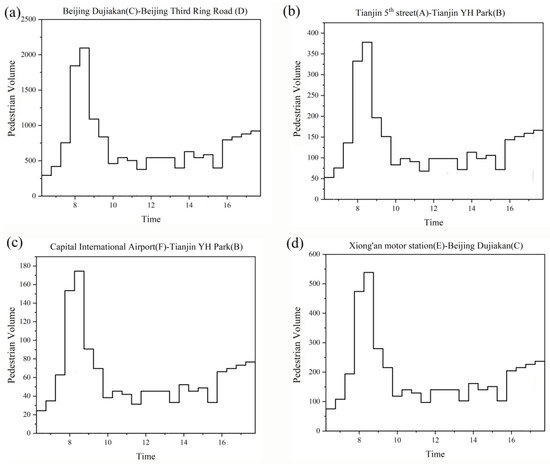 While considering daily eVTOL scheduling problems, it is necessary to ascertain the operating time and the relationship between passenger flow and time variation. As demonstrated by Dagi G. et al. [28], the flight rule for UAM is mainly the Visual Flight Rule (VFR), which results in the fact that eVTOLs cannot operate during the evening or night owing to their low visibility. Therefore, in this research, the operational time of eVTOLs is from 6:30 a.m. to 17:30 p.m., which indicates = 6.5 and = 17.5. Part of the passenger demand between vertiports at different times during this period (6:30–17:30) was determined based on Yihui W et al.’s [29] study and is shown in Figure 6. Furthermore, it is worth mentioning that as eVTOLs can only operate from 6:30 a.m. to 17:30 p.m., the passenger demand was also calculated in this time period. Moreover, in order to provide passengers with a better travel experience and alleviate ground transportation demand to the greatest extent, the maximum waiting time for passengers is 0.15 h (μ = 0.15 h) and the total number of passengers served by eVTOL services must not be less than 45% of the total demand (ε = 45%). Lastly, to ensure the safety of eVTOLs during takeoff and landing, the safe interval Ts is set as 5 min according to the document published by the CAAC [16]. To simplify the calculation, the maintenance cost is deemed to be 20% [28] of the purchasing cost .