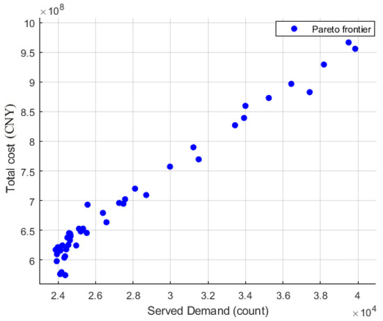After all the iteration times of cost and scheduling optimization were reached, the served passenger amount and the total cost under this eVTOL configuration and schedule was evaluated and optimized at the same time using Pareto dominance.