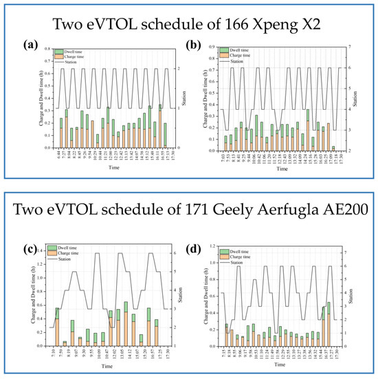 Parts of the schedule for different types of eVTOL. (a) The first Xpeng X2 (b) The 166th Xpeng X2 (c) The first Geely AE200 (d) The 171th Geely AE200.