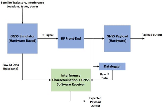 Figure 3. The Skydel Advanced GNSS Simulator was used to simulate various passes of JamSail CubeSat over an interference transmitter. This simulator provides two types of raw data, which are RF signal and IQ data (baseband). The RF signal will be received by an RF Front-End device. Then, the digitised output data from the Front-End will be loaded into the GNSS payload hardware, which is the FPGA board, or the digitised output from the Front-End will be loaded into GNSS software receivers such as MATLAB SWRx. This refers to the ground tests, where two approaches—the one with real hardware and the one using advanced simulation with Matlab tools—have been pursued.