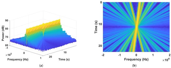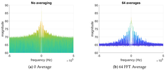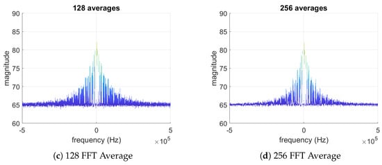 15 = 32,768 samples, which yielded a frequency resolution of 381 Hz and a time resolution of 2.62 ms at the simulator’s 12.5 Msps sampling frequency. In the hardware process, we tend to use a high sample frequency to make it more flexible and configurable, while, in the post-processing (MATLAB R2023a), we tend to use a low sample frequency to limit the power level. The next FFT was commenced halfway through the current one, following the sequence where the first sample in the n