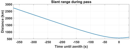 A simulation of the CubeSat passing from the transmitter’s horizon to its zenith was carried out. The slant range between the interference source and the CubeSat over the pass was calculated. As shown in