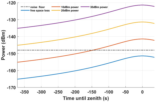 Figure 7. The signal’s frequency was set to 1575.42 MHz and its power was set to 10 dBm. A 20 s simulation was carried out, with the CubeSat crossing the interference transmitter’s zenith at approximately 10 s. The set of spectra resulting from converting the received signal to the frequency domain are shown in