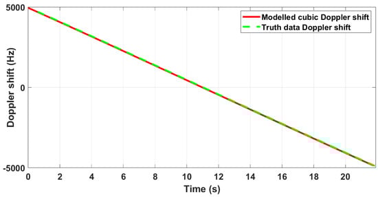 After the discrete Doppler shift had been isolated, the next step is to model it as a cubic equation to approximate the continuous-frequency Doppler shift. The result of this is again compared against the truth data to validate the accuracy of the modelling process. This has been plotted in