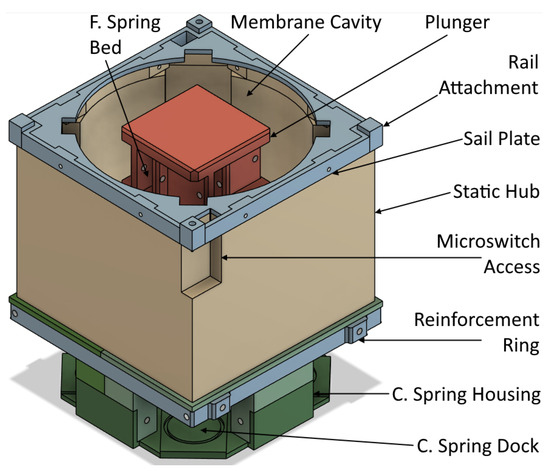Figure 16). This hub also features a membrane cavity, within which the membrane and flat springs are stowed under tension. Furthermore, beneath the static hub lies the compression spring housing (green,