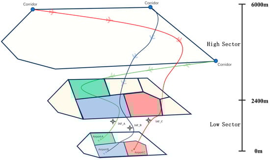 As shown in Figure 3, the flight procedures of each airport in the terminal area are analyzed. The schematic diagram illustrates the arrival process of aircraft from three different airports. After entering the terminal control area through the corridor, the aircraft is commanded by the coupled sector in the high sector and by the independent sector in the low sector.