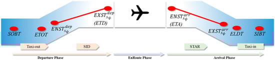 In the model constructed in this section, key resource nodes for incoming flight tasks encompass sectors, runways, and parking stands. Associated with these nodes are specific times: the time for aircraft entry into a sector (), the time for aircraft exit from a sector (), the time for aircraft landing (), and the time for wheels to be blocked (). Conversely, for departure flight tasks, pivotal resource nodes include parking stands, runways, and sectors, with corresponding time metrics: the time for aircraft to roll off (), the time for takeoff (), the time for entry into a sector (), and the time for departure from a sector ().