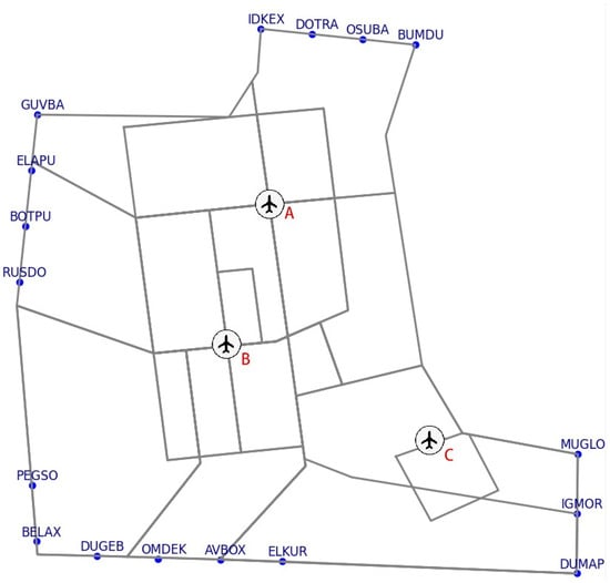 This article focuses on the Beijing multi-airport system (Beijing Metroplex Airport Group) in North China, illustrated in Figure 5, where A, B, and C denote Beijing Capital International Airport (ZBAA), Beijing Daxing International Airport (ZBAD), and Tianjin Binhai International Airport (ZBTJ), respectively. The blue dots represent the entrances to the terminal corridors. These airports collectively handle an annual passenger throughput exceeding 20 million, sharing multiple terminal control sectors, corridors, and arrival and departure flight procedures. This configuration results in a highly interconnected airspace resource system. Following a recent capacity assessment phase, there is an immediate need to allocate expanded resources for each airport’s capacity assessment.