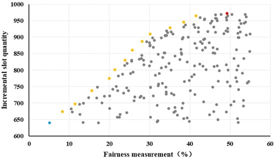 Based on the data presented in Table 3 and visualized in Figure 7, it is evident that to achieve an overall fairness measurement of the terminal control area between the extreme points of the Pareto front, there is a necessary sacrifice of 9.59% of the slot utilization rate to gain 44.15%. This trade-off highlights the balance between optimizing resource allocation and maintaining equitable distribution among the three airports.