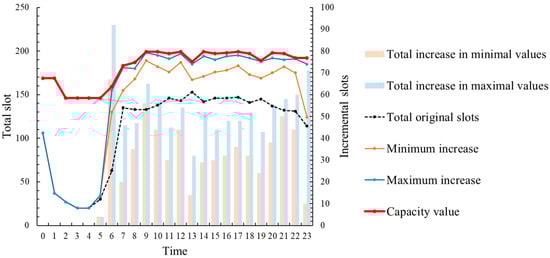 Figure 7 illustrates the comparison of resource allocation across different time periods. The left vertical axis represents the total amount of slots, serving as a reference for the line chart. The red line depicts the hourly capacity of coordination parameters for the three airports, while the orange line represents the total amount of slot expansion for the minimum value on the Pareto front, and the blue line represents the total amount of slot expansion for the maximum value on the Pareto front.