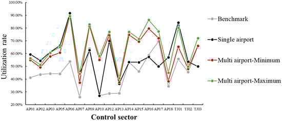 The utilization efficiency of the control sectors for each calculation example during peak hours, as depicted in Figure 8, can be analyzed as follows. In the single-airport example, sectors such as AP09, AP10, AP13, AP14, AP15, AP16, AP17, and TJ03 experience a significant decrease in regulatory utilization efficiency due to penalties imposed. Nevertheless, the efficiency of regulatory utilization in individual sectors remains higher compared to the benchmark example. This suggests that the historical resource tasks in the benchmark calculation have led to considerable airspace resource wastage in these control sectors. Conversely, in coupled control sectors following the implementation of a multi-airport model expansion (excluding AP01-AP07 and TJ01), the utilization efficiency of sectors outside TJ02 notably improves. This indicates that the expanded configuration of the multi-airport model positively influences the resource utilization efficiency of coupled control sectors. Through expanded configuration, the multi-airport model better aligns with capacity demand and resource allocation within the sector, enabling more effective utilization of available airspace resources. This could involve enhancements in aircraft path planning, leading to reduced conflicts and congestion, as well as load balancing.