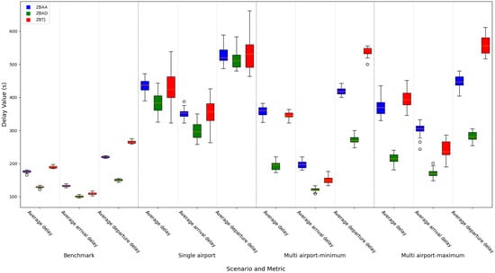 This box plot illustrates the distribution of delays for different airports and scenarios. The Y-axis represents the delay values in seconds, while the X-axis categorizes the data by four scenarios: “benchmark,” “single airport,” “multi-airport minimum,” and “multi-airport maximum.” Each scenario is further divided into three metrics: “average delay,” “average arrival delay,” and “average departure delay.” Different airports are distinguished by color: Beijing Capital International Airport (ZBAA) in blue, Beijing Daxing International Airport (ZBAD) in green, and Tianjin Binhai International Airport (ZBTJ) in red. The central line within each box represents the median, while the top and bottom boundaries of the box denote the upper and lower quartiles, respectively. The whiskers extend to the minimum and maximum values within 1.5 times the interquartile range (IQR), and any points outside this range are marked as outliers. Scene names are displayed below the second metric of each scene for clarity. This visualization allows for a clear comparison of delay patterns across different airports and scenarios, highlighting variations and potential outliers.