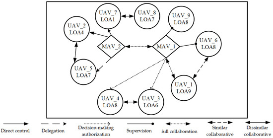The inter-UAV synergistic relationships include the following: ① similar collaborative relationships, in which similar actuators act on the same object, ② dissimilar collaborative relationships, in which dissimilar actuators act on the same object, and ③ no collaborative relationships, where actuators act on different objects. The MAV–UAV inter-organizational structure and the UAV–UAV inter-organizational structure are represented as follows: