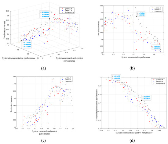 Comparison plot of optimized target spaces. (a) Three-dimensional target space. (b) Total effectiveness–system implementation performance target space. (c) Total effectiveness–system command and control performance target space. (d) System command-and-control performance–system execution performance target space.