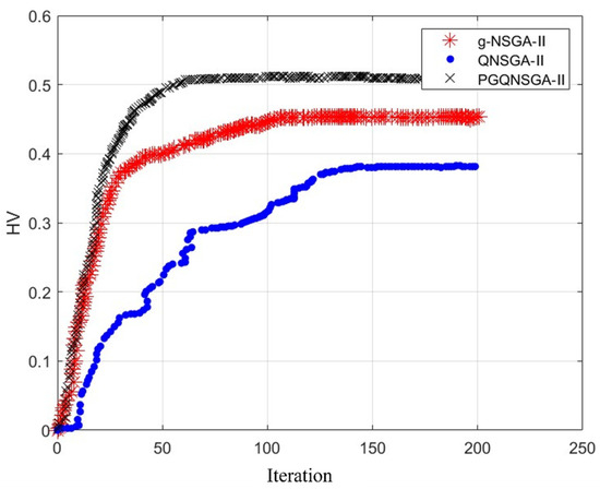 To further validate the performance of the PGQNSGA-II algorithm regarding convergence speed, Figure 5 illustrates the evolution of the Hyper-Volume (HV) metric concerning the number of iterations. Figure 5 indicates that the PGQNSGA-II algorithm demonstrates the fastest convergence speed, followed by the g-NSGA-II algorithm, while the QNSGA-II algorithm exhibits inferior performance in the context of the MAV/UAV COS architecture problem.