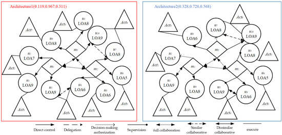 Figure 6 presents a comparison between two MAV/UAV COS architectures, using the selected Pareto solutions (0.119, 0.967, 0.311) and (0.328, 0.728, 0.568) indicated in Figure 4. These values correspond to the objective function components: system command-and-control performance, system implementation performance, and total effectiveness. In both architectures, the MAV–UAV relationships are fully collaborative. The Pareto solution chosen for Architecture 1 is more extreme, featuring the highest system execution performance but the lowest command-and-control performance. At this point, all UAV-and-manned-aircraft relationships are directly controlled, yielding a total effectiveness of 0.31. In contrast, the Pareto solution for Architecture 2 demonstrates a more balanced approach, reflecting significant modifications. Although the execution performance of Architecture 2 decreases by 24.7% relative to Architecture 1, the command-and-control performance improves by 176.5%, and the overall effectiveness rises by 82.6%.