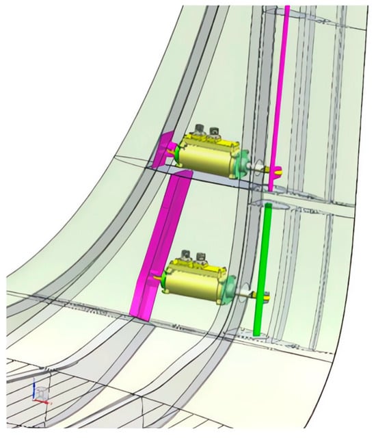 The research on and development of winglet tip devices with installed rudders have progressed rapidly and have reached a level suitable for practical application. Ignazio Dimino et al. [26,27] designed a deformation mechanism based on a permanent magnet brushless motor and ball screw drive that is directly installed inside the fixed wing surface of the winglet to control the deflection of the flaps. As shown in Figure 3, the flaps of the winglet are divided into two parts, each controlled by a set of this mechanism. The drive motor is fixed between the wing spars, with its output end directly connected to the screw shaft that mates with the screw. The screw is rigidly attached to the flap ribs at both ends, and its translational movement is constrained. Consequently, when the mechanism is activated, the screw’s original movement is forced to convert into rotational movement along the thread direction, thereby causing the flaps to deflect. Ignazio Dimino also established a complete wing model and conducted a dynamic analysis of the deformation device, verifying its theoretical feasibility.
