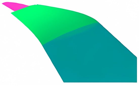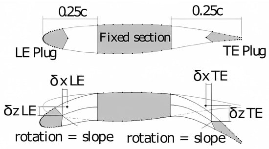 Due to the inevitable constraints imposed by the main wing on the deformation process of the winglet, current designs aimed at altering the winglet’s airfoil primarily focus on blended wing–body unmanned aerial vehicles [64,65,66] or wings with relatively low chord heights [3,67,68]. And these studies mainly concentrate on finite element simulations of the deformation process and aerodynamic performance analysis. For instance, Eguea et al. [67] proposed a segmented variable airfoil winglet, which uses a low-chord-height airfoil as the object. They defined the leading and trailing edge tips and the central 50% chord length as rigid, with the remaining parts made of deformable composite materials (Figure 13). Under the constraint of keeping the middle part’s baseline stationary, they conducted bending simulations. This study examined the results of optimizing the original airfoil through CFD simulations under five different flight conditions. It demonstrated that while the design reduces induced drag, it also causes weak shock waves during cruise to concentrate at the trailing edge tip, although these shock waves have little impact on the winglet’s performance. Eguea et al. [3] also calculated the contribution of this technology to reducing fuel consumption in commercial aircraft, showing that its application may carry eight more passengers in a maximum-range mission, or add 700 NM of aircraft range with a payload of four passengers, with the same fuel consumption as that of a fixed geometry for a 3125-mile mission.