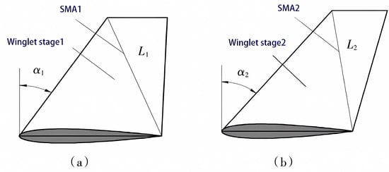 Zhang Chao et al. [58] developed a cable-type shape memory alloy (SMA) actuated variable a sweep angle winglet configuration. As illustrated in Figure 9, the memory effect metal wires are fixed to the leading edge of the winglet root and the trailing edge of the winglet tip like cables. When the temperature rises to the austenitic transformation temperature, the SMA will contract, causing the winglet tip to deform and thereby altering the sweep angle of the structure. Zhang Chao et al. tested the mechanical properties of the SMA, and theoretically calculated that an initial stress of 800 MPa, with a temperature control range of 70 to 170 °C, would enable the SMA to generate the required actuation force. However, their demonstration was limited to theoretical and numerical simulations, and no physical prototype was fabricated for experimental validation.
