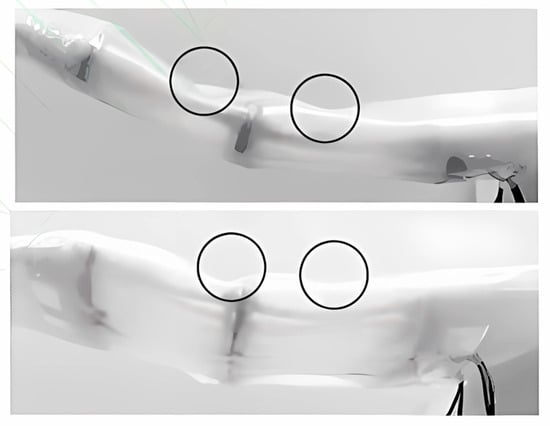 However, compared to the generation of design ideas, the fabrication and testing of prototype models presents numerous challenges, with the primary issue being defects such as wrinkles and delamination that occur in the skin material during deformation [61,62,63,64]. For instance, this was seen in the test experiments conducted by Xiaojun Gu et al., who designed a morphing winglet structure using SMA rods as the winglet spars and metal ribs combined to form the box [61], the skin of which was directly made of silicone rubber. Wrinkles appeared during the bending of the winglet (Figure 10), and this phenomenon did not disappear even after replacing the skin with a material that had better elasticity and higher fit with the box. To address this issue, some scholars have focused on optimizing the winglet box structure. For example, Li Wei et al. [62] utilized shape memory alloy springs to drive a variable-angle winglet, as shown in Figure 11. The winglet’s skeleton structure consists of a central curved beam and two SMA springs on either side. Since only the transition part from the main wing to the winglet can deform, and the winglet skin is primarily supported by the ribs without contacting the deformed curved beam, it maintains a relatively intact shape during wind tunnel experiments.